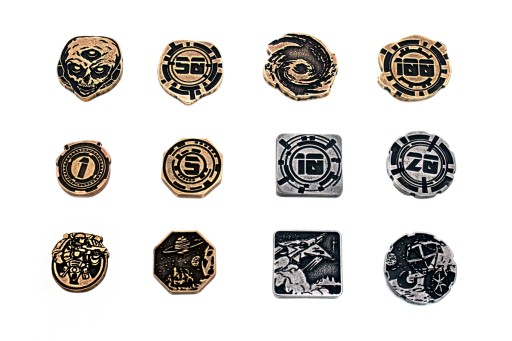 W tej kategorii znajdziesz monety metalowe związane z konkretnymi motywami lub tytułami gier. Zestawy zawierają produkty imitujące złoto (pokryte warstwą mosiądzu), srebro (warstwą niklu) lub miedź (warstwą miedzi). Ich wzory nawiązują do gier postapo, fantasy, steampunkowych, utrzymanych w klimacie średniowiecza, starożytności, kosmosu, oraz powieści Lovecrafta.