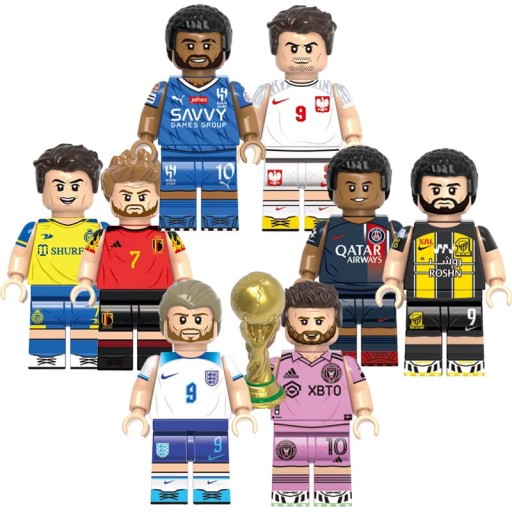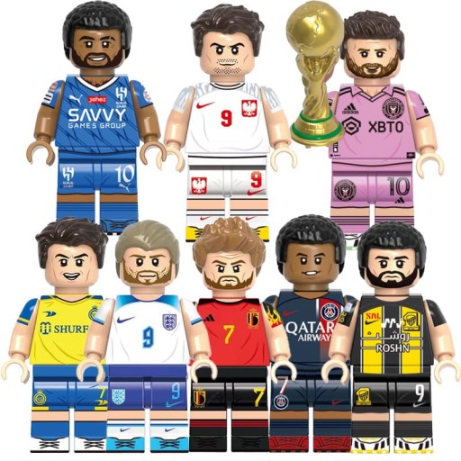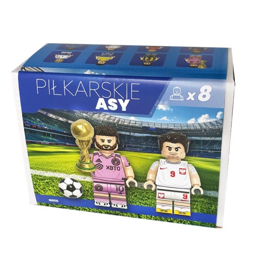 - 8 szt figurek najbardziej popularnych piłkarzy w ciągu ostatniego roku (każda figurka posiada w komplecie czarno-białą piłkę oraz czarną podstawkę do postawienia, figurka Messiego posiada złoty puchar x 1 szt);