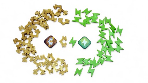 - pudełko z przegródką na karty przeciwnika do gry solo i przegródką na złote części oraz żeton pierwszego gracza.