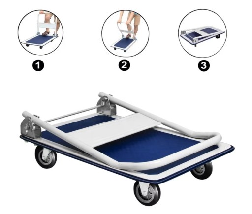 ✨Wózek ma 4 koła: 2 skrętne i 2 stałe. Rączka jest składana na płasko, dzięki czemu wózek zajmuje niewiele miejsca podczas przechowywania czy transportu.