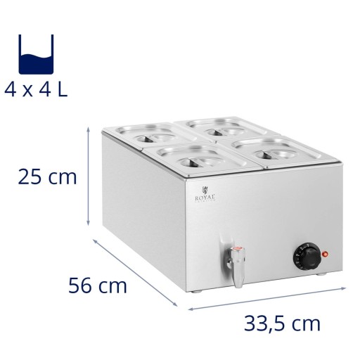 Świeże potrawy utrzymywane w cieple przez długi czas brzmią apetycznie? Z bemarem marki Royal Catering to się uda! W 4 pojemnikach GN umieścisz np. mięso, rybę, ziemniaki, ryż lub sos. Utrzymają żądaną temperaturę bez przypalania. Bemar grzewczy optymalnie zaspokoi potrzeby lokali gastronomicznych nawet wysokiej klasy. Nadaje się do użytku w restauracjach, hotelach, pensjonatach, stołówkach, bufetach, barach z przekąskami, kawiarniach lub domach seniorów i klinikach.