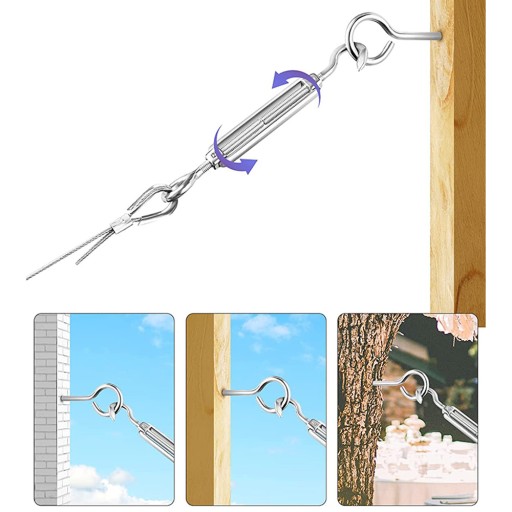 Śruba napinająca M6 ma doskonały zakres regulacji, umożliwia napinanie linki, aby uzyskać ciasny i schludny wygląd; Tuleje zaciskowe wykonane z aluminium, zapewniają dobrą odporność na korozję i rdzę, pozwalają na używanie w każdych warunkach pogodowych!
