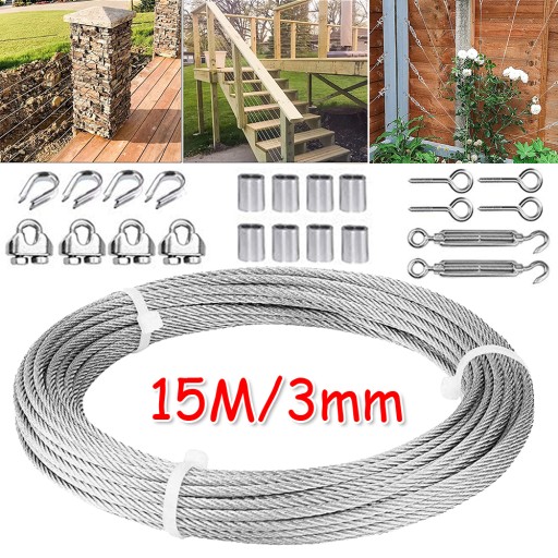 3 mm stalowa lina stalowa z zestawem napinaczy może być używana do wykonywania szerokiego zakresu ciężkich zadań i zapewnia większą elastyczność użytkowania, w tym do zawieszania zewnętrznych sznurów oświetleniowych, zestawów łańcuchowych, zestawów drutów do kratownic, zestawów drutów do glicynii na ściany, zestawów drutów do roślin, zestawów drutów do pergoli, zestawów sznurków do bielizny
