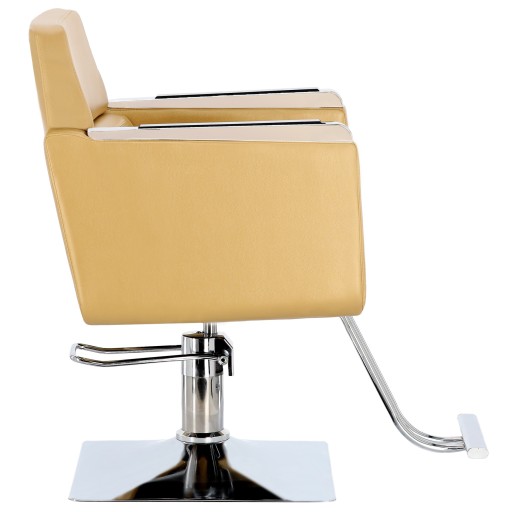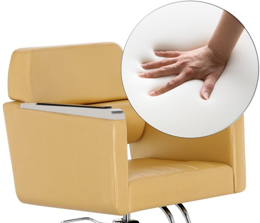 Fotel charakteryzuje się eleganckim i ergonomicznym designem, który pozwala na wygodną pracę fryzjera oraz relaks klientów.