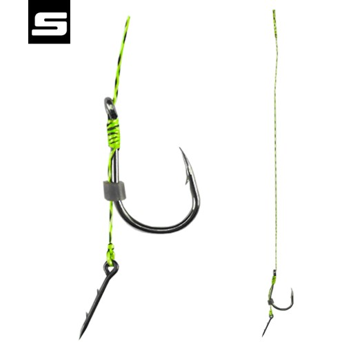Włos z igłą: Każdy przypon posiada włos zakończony igłą o długości 7 mm z podwójnym zadziorem, co ułatwia mocowanie przynęty, zapewniając jej stabilność podczas rzutu i w wodzie.