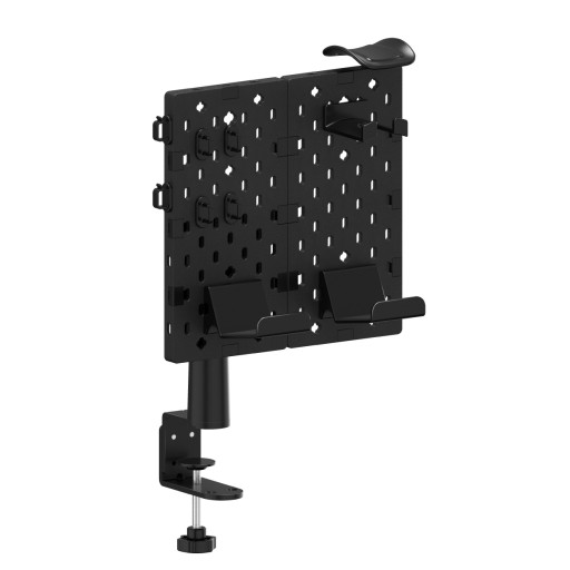 - Organizer wyposażony jest w kilka uniwersalnych uchwytów: 1 wieszak na słuchawki, 2 miejsca na pady oraz 4 haczyki na kable lub inne akcesoria.