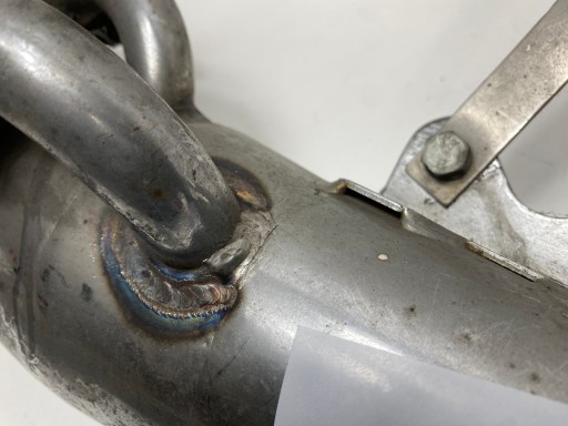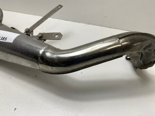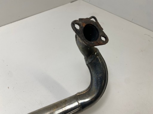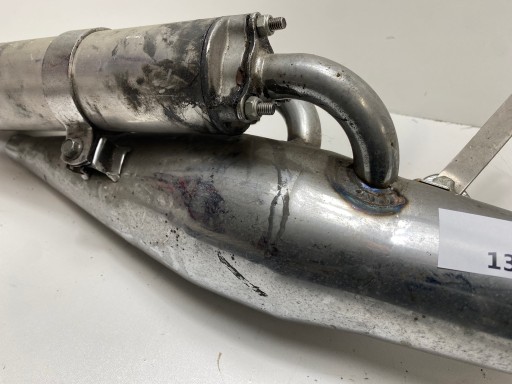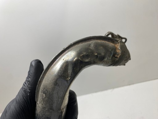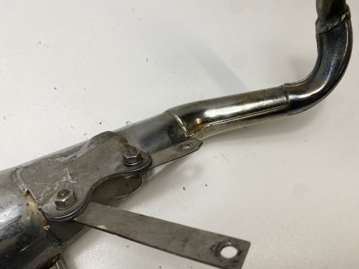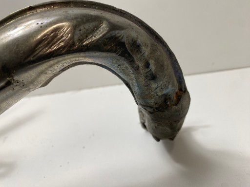 Przedmiot posiada wgniotki na kolanku, brak oryginalnego mocowania, pęknięty przy końcówce, spawany przy kolanku