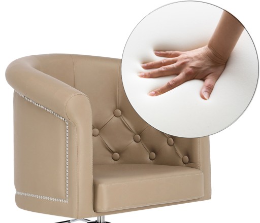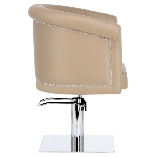 Fotel charakteryzuje się eleganckim i ergonomicznym designem, który pozwala na wygodną pracę fryzjera oraz relaks klientów.