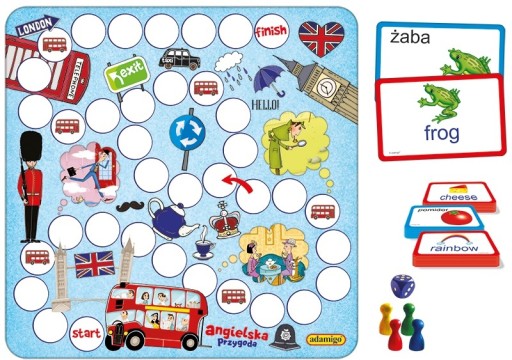 Ta niezwykła wycieczka po Londynie umożliwia podczas świetnej zabawy, utrwalenie angielskiego słownictwa. Gra zawiera ponad 100 dwustronnych kart z angielskimi słówkami, na których znajdują się nazwy przedmiotów, zwierząt, kształtów, kolorów i liczb.W środku znajduje się instrukcja, zawierająca opis dwóch gier. Karty można także wykorzystać podczas samodzielnej nauki angielskich słówek!zestaw zawiera:• planszę • karty• 4 pionki i kostkę• instrukcję