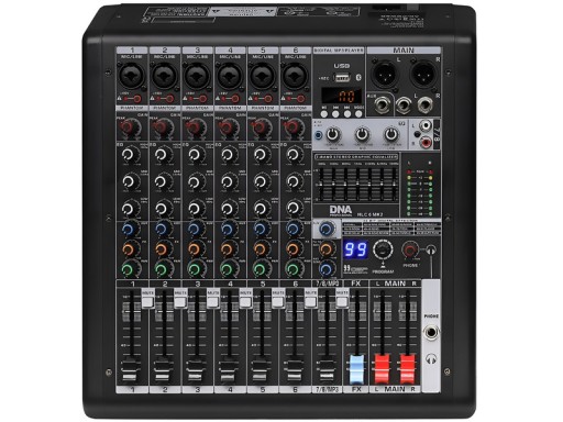 Każdy z sześciu kanałów miksera audio wyposażony jest w zbalansowane wejście MIC/LINE, które umożliwia podłączenie sygnału o wysokiej impedancji, oraz w przełącznik zasilania Phantom +48V. Do tych wejść można podłączyć nie tylko mikrofon, ale również urządzenia takie jak gramofon, konsola DJ czy instrumenty klawiszowe. Każdy kanał oferuje kontrolę nad parametrami takimi jak poziom wzmocnienia sygnału, regulacja tonów wysokich, średnich i niskich, efekty, a także możliwość izolacji lub wyciszenia kanału. Można również ustawić poziom sygnału AUX oraz panoramę między kanałami lewym i prawym. Płynna regulacja głośności jest możliwa dzięki suwakowym tłumikom, a ewentualne przesterowania sygnalizowane są za pomocą czerwonej diody LED. Główna sekcja miksera pozwala na podłączenie zewnętrznego urządzenia rejestrującego lub odtwarzacza, odbieranie sygnału powrotnego z innych urządzeń oraz sterowanie cyfrowym procesorem z 99 multiefektami. Dodatkowo, 7-pasmowy korektor graficzny umożliwia precyzyjną regulację brzmienia miksu, który można monitorować za pomocą słuchawek. Atutem DNA HLC 6 MK2 jest również opcja kontroli poziomu FX TO AUX.
