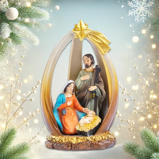 Ta wyjątkowa szopka bożonarodzeniowa przedstawia Świętą Rodzinę ujętą w unikalnej owalnej konstrukcji z widoczną Gwiazdą Betlejemską. Ręczne malowanie zapewnia każdej figurce niepowtarzalny charakter, podkreślając szczegóły i nadając jej wyjątkowy wygląd. Precyzyjnie wykonana z trwałej żywicy, stanowi elegancką i symboliczną ozdobę na święta.
