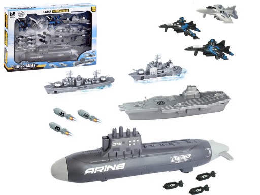 Zestaw małego żołnierza samoloty, statki wojskowe, łódź podwodna to wszystkie niezbędne sprzęty do prowadzenia działań batalistycznych. Mały strateg będzie miał do dyspozycji morską flotę oraz trzy samoloty bojowe patrolujące obszar z powietrza.