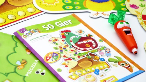 To wspaniałe opakowanie zawiera niezmiernie bogaty zestaw do zabawy w towarzystwie Marchewki i nauki wszystkich podstawowych treści dydaktycznych. Dzieci mają do dyspozycji mówiącą i podświetlaną Marchewkę oraz mnóstwo materiałów wykonanych z grubego kartonu, przedstawiających sympatyczne zwierzęta, a także pożywienie i przedmioty ze świata farmy. Ponadto opakowanie zawiera wiele jajeczek z literkami służących do nauki pisania i do grania z zabawne gry społecznościowe. Do opakowania dołączono również dwustronny maxi plakat zawierający wiele quizów, które dziecko rozwiązuje za pomocą marchewki. Łącząc ze sobą wszystkie dołączone materiały, można zagrać w 50 gier, które bawią i uczą.