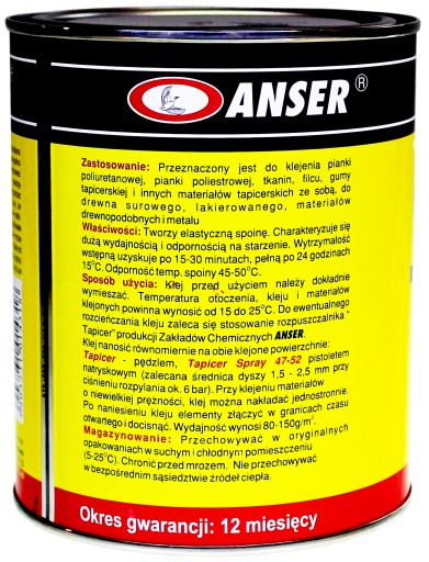 Klej TAPICER klei gąbkę poliuretanową, gąbkę poliestrową, tkaniny satynowe, filc, jutę, gumę meblarską, dywany itp. Posiada on bardzo dobrą wytrzymałość potwierdzoną przeprowadzonymi doświadczeniami, jako klej stosowany do podłoża betonowego, metalowego, drewna surowego i lakierowanego, płyt eternitowych. Wszystkie wymienione materiały można kleić we wzajemnych kompozycjach.
