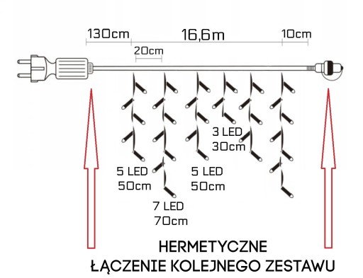 Zestaw izolowany z grubą wtyczką zasilająca. Wtyczka wykonana w standardzie IP44. Sople posiadają również hermetyczne łączenie igłowe pozwalające na przyłączenie kolejnych zestawów.