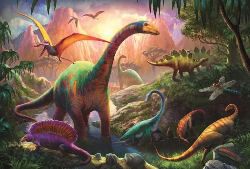 Puzzle 100 elementów z zabawnym obrazkiem przedstawiającym prehistoryczne gady. Po ułożeniu powstanie obrazek o wymiarach 41x27,8 cm. Wysoką jakość, nasycenie kolorów i bezpieczeństwo układania zapewnia kalandrowany papier odbijający światło i wykorzystanie materiałów ekologicznych.