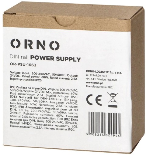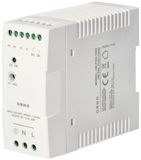 Zasilacz na szynę DIN przemysłowy 24VDC, 2.5A, 60W, Orno, OR-PSU-1663