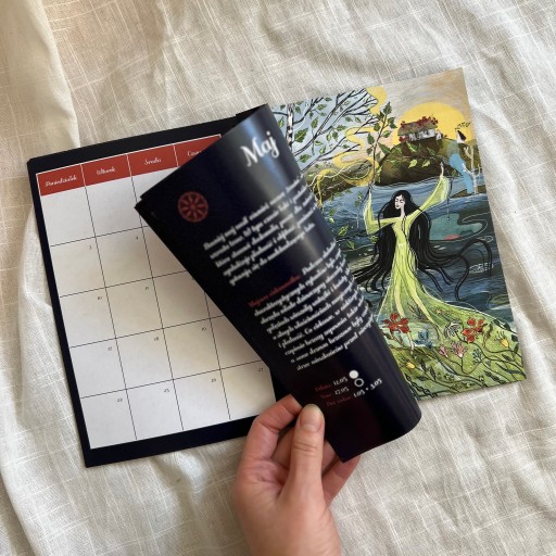 ✸ 1 rozkładówka ze stroną miesiąca z oznaczonymi świętami słowiańskimi, pełnią oraz nowiem księżyca, przesileniami i równonocami, dniami wolnymi, ciekawostką oraz ilustracją na każdy miesiąc