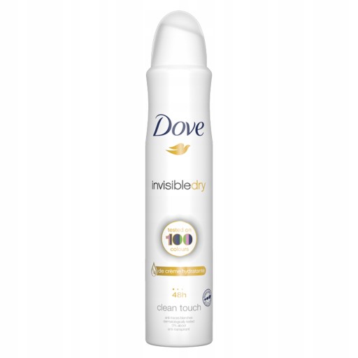 Dove Invisible Dry antyperspirant w aerozolu został stworzony dla kobiet, które najlepiej czują się w czerni. Udowodniono, że jest to pierwszy antyperspirant, który nie zostawia plam na 100 kolorach. Antyperspirant w aerozolu daje Ci swobodę noszenia najbardziej wyrazistych, jaskrawych kolorów.