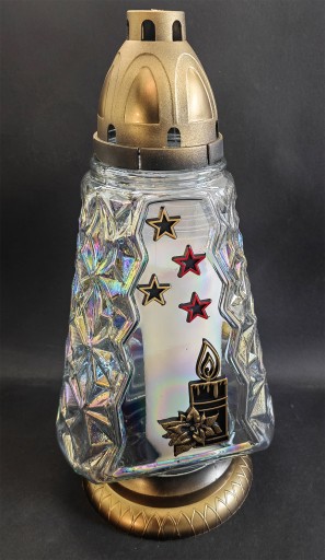 Pięknie wykonany szklany znicz w kształcie choinki. Dodatkowo ozdobiony kolorowymi gwiazdkami oraz świecą. Wszystkie elementy doskonale do siebie pasują, są wykonane precyzyjnie i estetycznie.