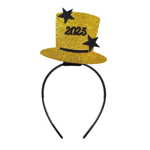 Opaska w kształcie złotego, piankowego, brokatowego kapelusika z czarnymi gwiazdkami i napisem "2025" to doskonały dodatek do sylwestrowego przebrania! Dodaj odrobinę błysku całej swojej kreacji, wchodząc z radością w nowy, kolejny rok!