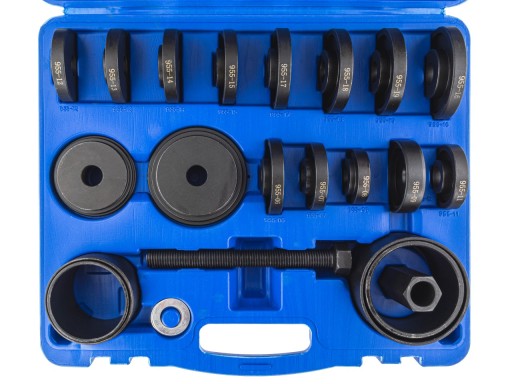 Zestaw przeznaczony do wymiany łożysk kół przednich bezpośrednio na samochodzie za pomocą łożyskowanej śruby ściągającej. Szeroki wybór różnych rozmiarów misek i tulei dystansowych umożliwia zastosowanie do większości sprzedawanych samochodów. Zestaw jest odpowiedni także do stosowania na prasie hydraulicznej lub mechanicznej podczas demontażu łożysk, tulei i innych części obrotowych.