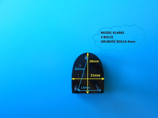Zapraszam do zakupu fleków polskiego producenta,który jest dostawcą tych fleków do wiekszosci producentów obuwia renomowanych firm w Polce.Fleki nie stukają są odporne na scieranie oraz bardzo proste w montażu-wystarczy wyciągnąć stary flek i wbić nowy.Rozmiar można spokojnie dobrać samemu-wystarczy zmierzyć stary flek lub obcas od strony zużytego fleka i dobrać rozstaw bolczyków-potrzebna są następujące rozmiary wyjasnione na zdjęciu: