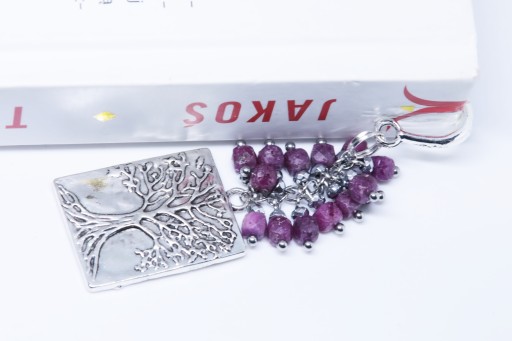 Elegancka zakładka do książki z zawieszką z motywem drzewa. Dodatkowo do zawieszki zostały dorobione kawałki rubinu oraz srebrnego hematytu.