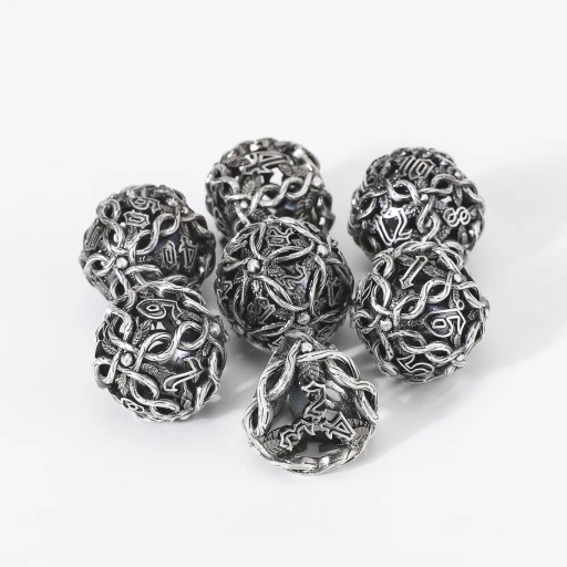 Zestaw 7 metalowych kości idealnych na sesję RPG.