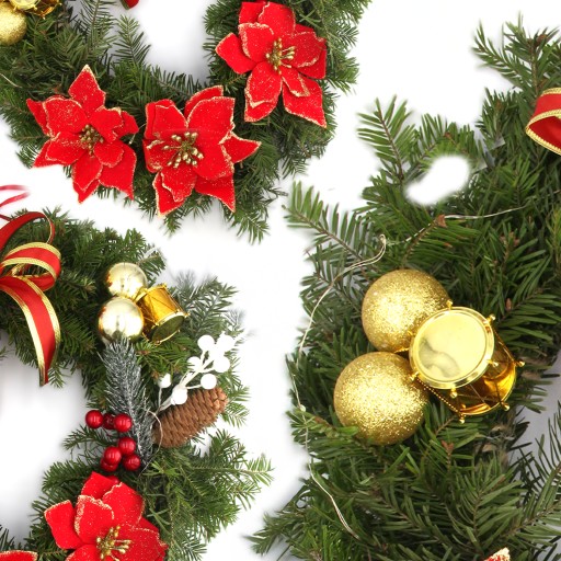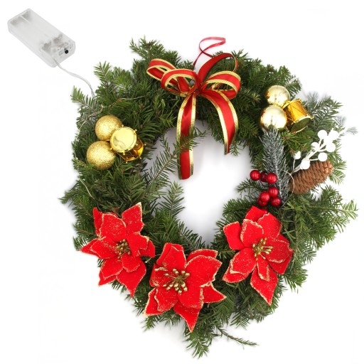 - elementy wystepujące na kazdym wieńcu: kwiaty poinsecji, świeża szyszka, gałązka jemioły, złote bombki, kokarda oraz światełka w kolorze bieli o długości 1 m