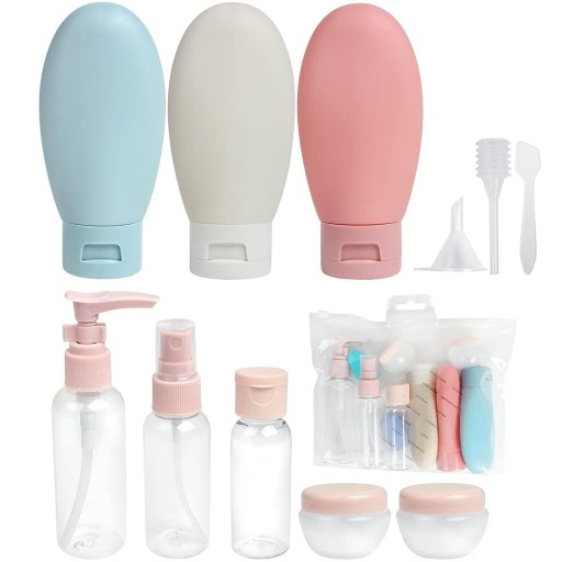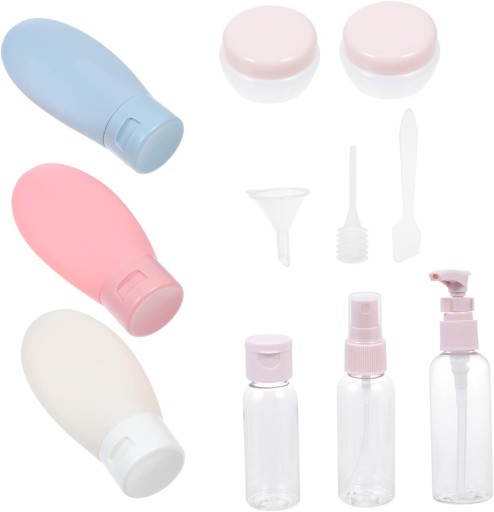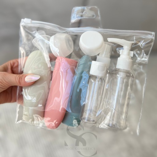 ⭐Zestaw pojemników podróżnych na kosmetyki do samolotu 10szt + Kosmetyczka - wielorazowe butelki do bagażu podręcznego⭐