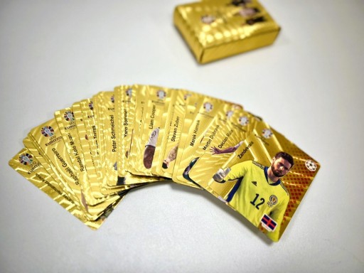 ➡️W zestawie znajduje się 55 połyskujących kart przedstawiających najlepszych zawodników znanych z rozgrywek piłkarskich ostatnich lat. Karty zapakowane są w eleganckie, ozdobne opakowanie, dostępne w wariancie koloru metalicznego złotego.