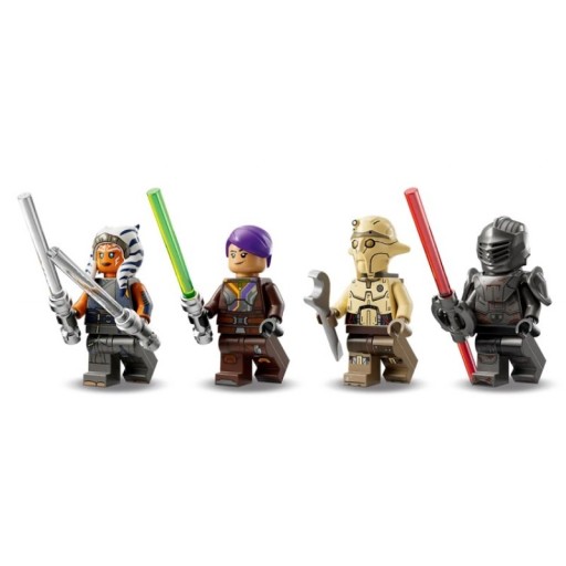 • Cztery minifigurki Star Wars™ — Ahsoka Tano z dwoma mieczami świetlnymi, Sabine Wren z dwoma blasterami, profesor Huyang z kluczem i Marrok z podwójnym mieczem świetlnym