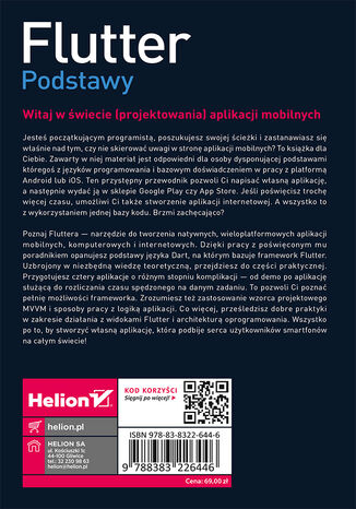 Witaj w świecie (projektowania) aplikacji mobilnych Jesteś początkującym programistą, poszukujesz swojej ścieżki i zastanawiasz się właśnie nad tym, czy nie skierować uwagi w stronę aplikacji mobilnych? To książka dla Ciebie. Zawarty w niej materiał jest odpowiedni dla osoby dysponującej podstawami któregoś z języków programowania i bazowym doświadczeniem w pracy z platformą Android lub iOS. Ten przystępny przewodnik pozwoli Ci napisać własną aplikację, a następnie wydać ją w sklepie Google Play czy App Store. Jeśli poświęcisz trochę więcej czasu, umożliwi Ci także stworzenie aplikacji internetowej. A wszystko to z wykorzystaniem jednej bazy kodu. Brzmi zachęcająco? Poznaj Fluttera - narzędzie do tworzenia natywnych, wieloplatformowych aplikacji mobilnych, komputerowych i internetowych. Dzięki pracy z poświęconym mu poradnikiem opanujesz podstawy języka Dart, na którym bazuje framework Flutter. Uzbrojony w niezbędną wiedzę teoretyczną, przejdziesz do części praktycznej. Przygotujesz cztery aplikacje o różnym stopniu komplikacji - od demo po aplikację służącą do rozliczania czasu spędzonego na danym zadaniu. To pozwoli Ci poznać pełnię możliwości frameworka. Zrozumiesz też zastosowanie wzorca projektowego MVVM i sposoby pracy z logiką aplikacji. Co więcej, prześledzisz dobre praktyki w zakresie działania z widokami Flutter i architekturą oprogramowania. Wszystko po to, by stworzyć własną aplikację, która podbije serca użytkowników smartfonów na całym świecie!