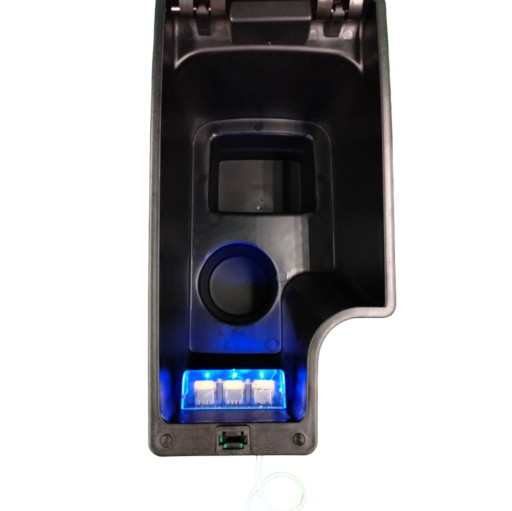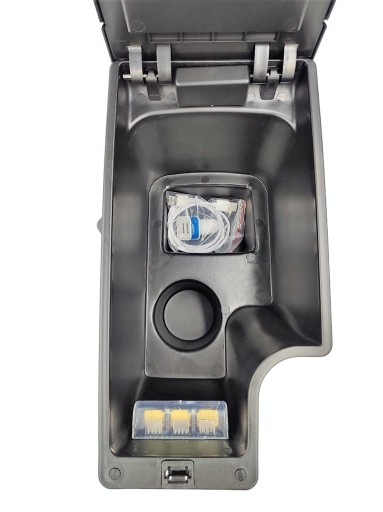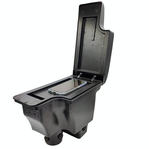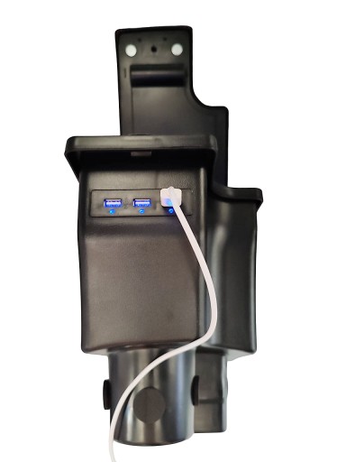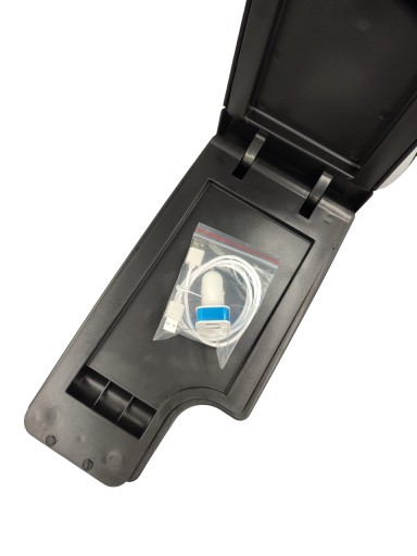 Podłokietnik posiada z przodu gniazda USB, dzięki którym można ładować 2 urządzenia na raz (smartfony, tablety itp.). Aby je zasilić należy podłączyć pierwsze gniazdo kablem z fabrycznym gniazdem USB lub z ładowaką do gniazda zapalniczki.