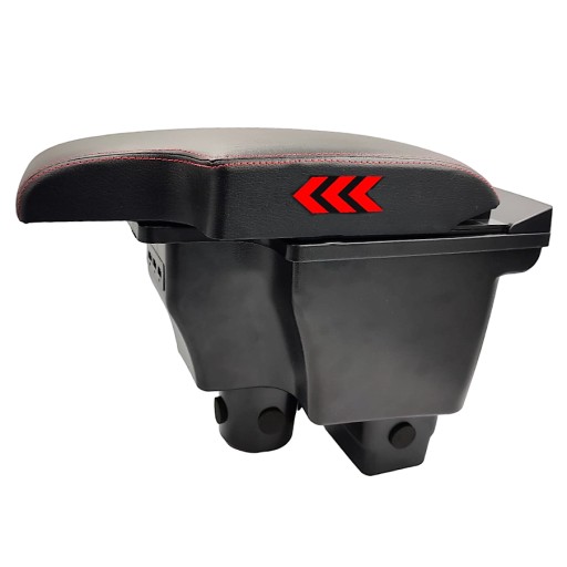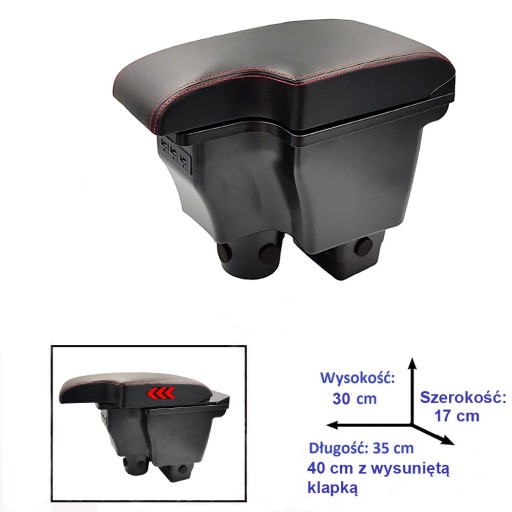 Podłokietnik został wykonany w eleganckim kolorze czarnym, co sprawia, że doskonale komponuje się z wnętrzem samochodu. Dodatkowo, czerwona nić dodaje mu stylowego i nowoczesnego charakteru.