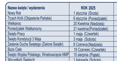 TABELA Z OPISANYMI DATAMI I DNIAMI WOLNYMI OD PRACY