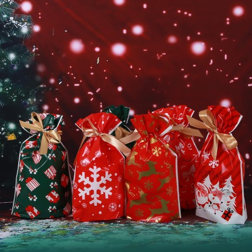 - Woreczki wykonane są z trwałego materiału o świątecznych wzorach, co sprawia, że są one doskonałym uzupełnieniem każdego prezentu.