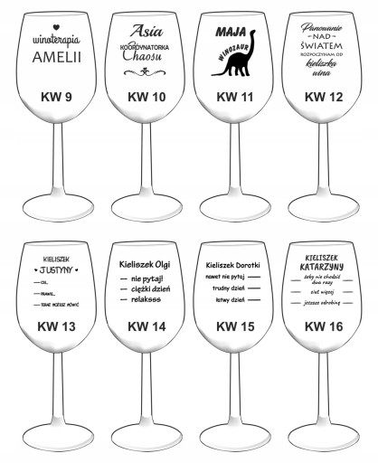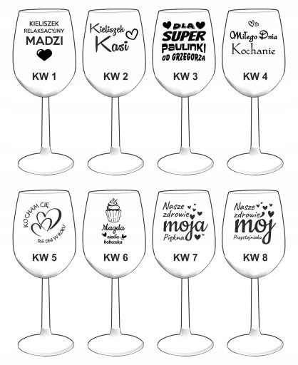 Możesz u nas zamówić kieliszek do wina znanej na całym świecie polskiej renomowanej firmy pojemność 860 ml (bardzo duży ) zapakowany w dedykowane opakowanie prezentowe, (nic nie musisz robić wyjmujesz z paczki i masz gotowy do podarowania prezent) na kieliszku zostanie wykonany grawer laserowy według wytycznych osoby zamawiającej. Możesz wybrać gotowy wzór, który proponujemy poniżej (każdy wzór można dowolni poprawiać: IMIONA, DATY, NAPISY itp.. np.: Kamil zmienić na Darek lub nie pytaj na nie zapytuj lub relaksss na jest dobre a będzie jeszcze lepiej ...... itd ....