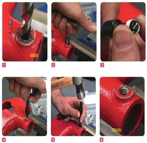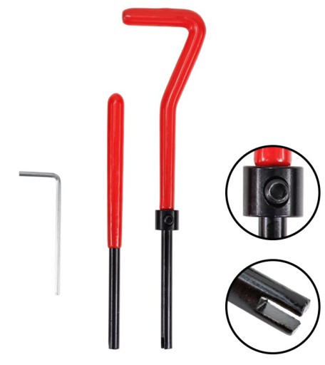 Wiertła i gwintowniki wykonane ze stali szybkotnącej HSS. Gwintownik jednostopniowy, nacina gwint, w który wkręca się wkładkę spiralną z utwardzonej stali nierdzewnej. Do wprowadzenia wkładki służy wkrętak prowadzący, oraz wybijak, który obłamuje końcówkę wkładki.