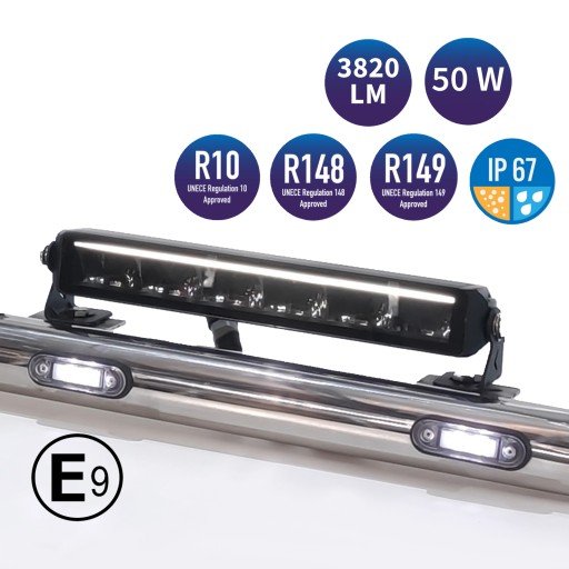 2. Zestaw 2 halogenów listwowych z homologacją drogową i certyfikatem oznaczonym na szkle: