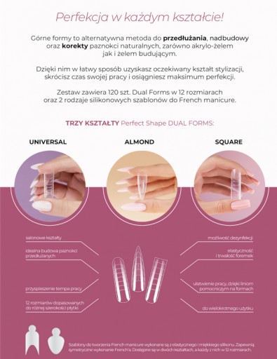 1. Dual Formy to alternatywna metoda dla przedłużania, nadbudowy oraz korekty paznokci naturalnych, zarówno akrylo-żelem jak i żelem budującym. Dzięki nim w łatwy sposób uzyskasz oczekiwany kształt stylizacji, skrócisz czas swojej pracy i osiągniesz maksimum perfekcji.
