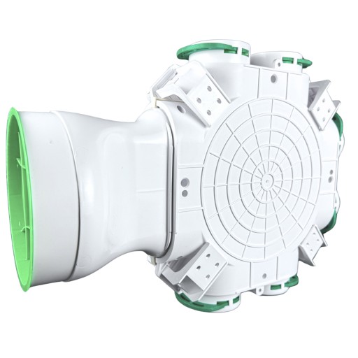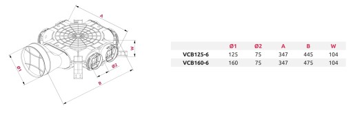 Skrzynka rozdzielcza Awenta PRO umożliwia podłączenia do 6 kanałów wentylacyjnych Ø75. Podobnie jak w pozostałych skrzynkach rozdzielczych serii VCB nieużywane króćce mogą zostać zamknięte przy pomocy zaślepek z uszczelką dołączonymi do zestawu. Skrzynkę charakteryzuje boczne przyłącze dostępne w dwóch wariantach o średnicy Ø160 mm oraz Ø125 mm.
