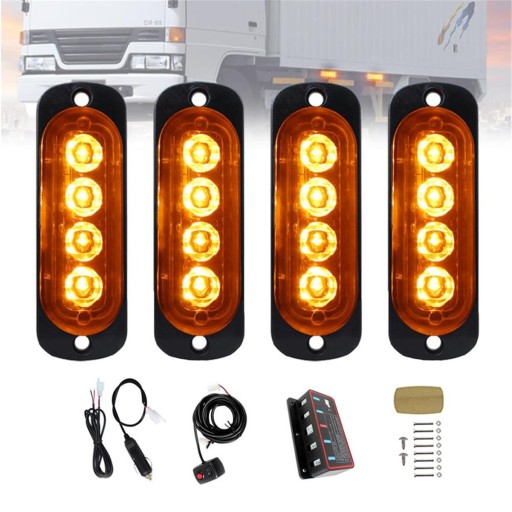 Profesjonalny komplet/zestaw stroboskopów 4 LED 12V DC. Zestaw świeci pomarańczowym światłem, do wyboru kilka programów świecenia za pomocą sterownika, stroboskopy wodoszczelne. Moc zestawu 16W (4 x 4 LED).