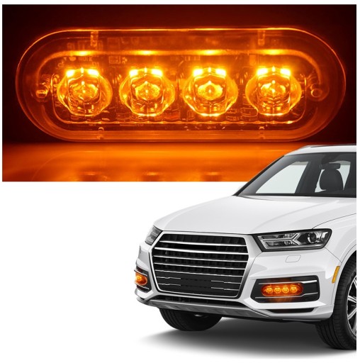 Profesjonalny komplet/zestaw stroboskopów 4 LED 12V DC. Zestaw świeci pomarańczowym światłem, do wyboru kilka programów świecenia za pomocą sterownika, stroboskopy wodoszczelne. Moc zestawu 16W (4 x 4 LED).