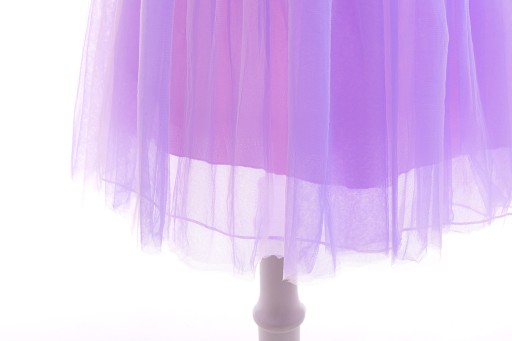 - Podstawą stroju jest piękna, satynowa sukienka w ciepłych odcieniach różu i fioletu. Każda mała księżniczka poczuje się w niej wyjątkowo, a błyszczący tiul i zdobienia na gorsecie dodają elegancji.