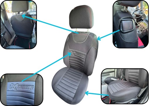 Pokrowce zakrywają całą część frontową i boczną fotela, skutecznie chroniąc tapicerkę przed zabrudzeniami, przetarciami i uszkodzeniami mechanicznymi.