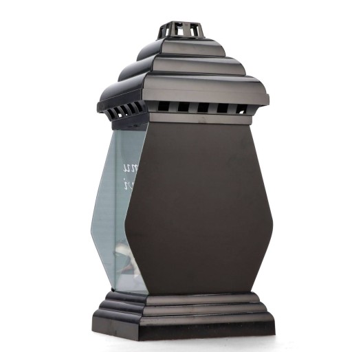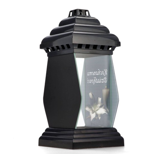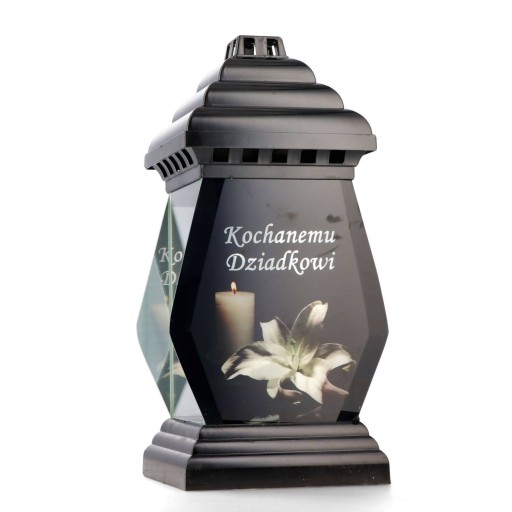 - Materiał i kolor: Podstawa i kapturek wykonane z plastiku w kolorze czarnym, boczne ściany ze szkła przezroczystego, tylna ścianka z lustra, przednia ścianka to szkło z nadrukiem. Na nadruku znajduje się napis "Kochanemu Dziadkowi", grafika białej lilii oraz zapalonej świecy.