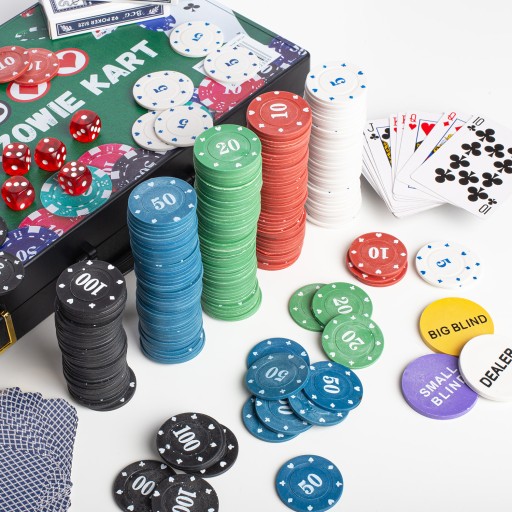 W zestawie znajdziesz wszystko, co jest niezbędne do rozpoczęcia gry: kolorowe żetony w różnych nominałach, dwie talie kart, kostki do gry oraz wygodną, plastikową walizkę, która ułatwia transport i przechowywanie zestawu.