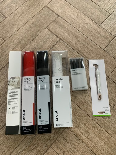 Zestaw materiałów Cricut zawiera matę do cięcia, haczyk, zestaw mazaków, folie w trzech kolorach, papiery kolorowe samoprzylepne oraz białą folię termotransferową.
